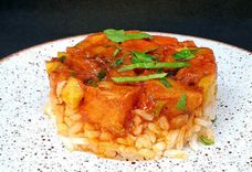 200/100 г • Филе Хека, томленное с овощами, подается с рисом