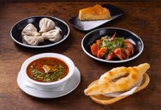 150/75/200/300/95/80 г • Суп «Харчо», салат из свежих помидоров и огурцов по-грузински, хинкали классические (4 шт.), гузинский яблочный пирог, грузинский хлеб «Шоти»
